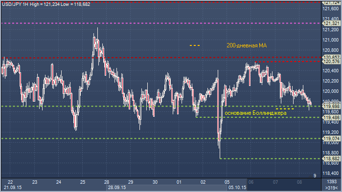 Доллар/иена. Технический взгляд Сопротивление 4: Y121.82 - минимум 21 августа, в настоящее время - сопротивление Сопротивление 3: Y121.32 - максимум 10 сентября Сопротивление 2: Y120.89 - 200-дневное скользящее среднее значение Сопротивление 1: Y120.57 - максимум 6 октября Цена: Y119.75 Поддержка 1: Y119.69 - часовая поддержка 7 октября Поддержка 2: Y118.80 — нижняя граница недельного канала Боллинджера Поддержка 3: Y118.68 - минимум 2 октября Поддержка 4: Y118.23 - часовая поддержка 24 августа