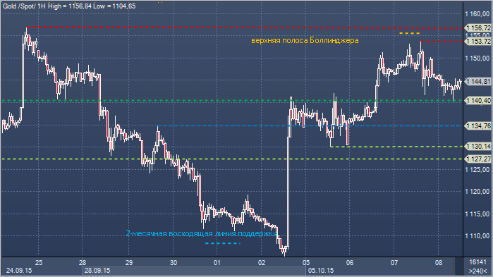 Золото. Технический взгляд Сопротивление 4: $1169,9 - месячный максимум 24 августа Сопротивление 3: $1156,7 - месячный максимум 24 сентября Сопротивление 2: $1155,6 — верхняя полоса Боллинджера Сопротивление 1: $1153,7 - максимум 7 октября Цена: $1144,8 Поддержка 1: $1140,4 - часовая поддержка 8 октября Поддержка 2: $1130,3 - минимум 5 октября Поддержка 3: $1128,7 - 21-дневное скользящее среднее значение Поддержка 4: $1121,0 - 55-дневное скользящее среднее значение