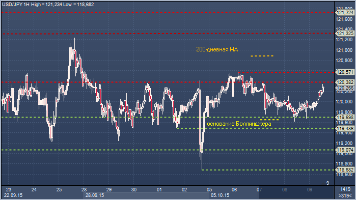 Доллар/иена. Технический взгляд Сопротивление 4: Y121.32 - максимум 10 сентября Сопротивление 3: Y120.88 - 200-дневное скользящее среднее значение Сопротивление 2: Y120.57 - максимум 6 октября Сопротивление 1: Y120.38 - часовое сопротивление 6 октября Цена: Y120.26 Поддержка 1: Y119.64 - основание Боллинджера Поддержка 2: Y118.81 — нижняя граница недельного канала Боллинджера Поддержка 3: Y118.68 - минимум 2 октября Поддержка 4: Y118.23 — часовая поддержка 24 августа