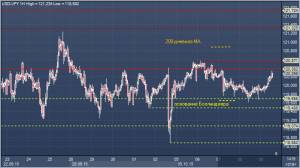 Комментарий:: пара продолжает разгуливать в пределах широкого диапазона Y118.23-121.82, неоднократно пытаясь закрыться выше 200-дневного скользящего среднего значения, чему так и не хватало сил, в результате следовали спады обратно к нижней границе этого диапазона. До закрытие выше 200-дневного скользящего среднего значения небольшой медвежий уклон останется в силе, а медведи будут сосредоточены на тестировании Y118.23-68. Быки будут искать закрытия выше Y120.57, чтобы добавить некоторой поддержки своему делу, но закрытие выше 200-дневного скользящего среднего значения является ключевым моментом.