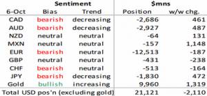Спекулянты решительно нерешительны. В последние четыре недели имели место лишь незначительные корректировки позиций, однако базовая тема – покупка доллара против большинства основных валют – осталась неизменной. Как следует из последних данных CFTC, за неделю до 6 октября объем чистого спекулятивного лонга по американской валюте сократился с $23.3 млрд до $21.1 млрд, в основном, благодаря массовому закрытию позиций в мексиканском песо. В целом, спекулянты занимают выжидательную позицию, чувствуя себя комфортно в покупке доллара, однако, не желая наращивать объем позиций до прояснения перспектив дальнейших действий FOMC. Крупнейшей по объему остается продажа евро, однако недельное изменение носит характер статистической погрешности. В то же время объем короткой позиции в фунте удвоился, но остается невысоким. Спекулянты продолжили продавать франк и довольно ощутимо сократили шорт в иене. В товарных валютах, таких как аусси и луни, продолжилась ликвидация шортов, а спекулятивная позиция по киви почти вышла в ноль.