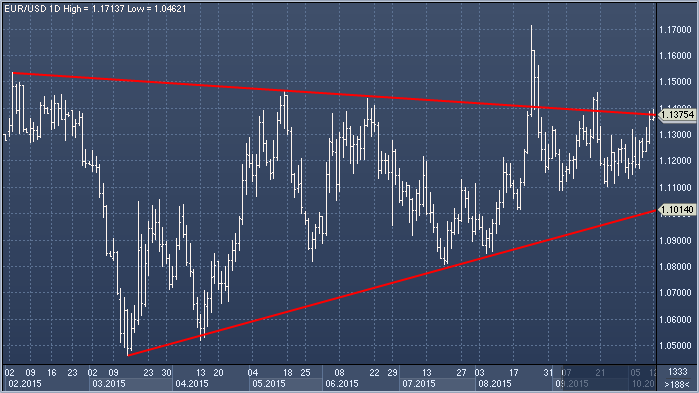 В конце прошлой недели евро/доллар неплохо подорожал на фоне роста антирисковых настроений, однако, на наш взгляд, в ближайшие недели ситуация изменится. Во-первых, на первый план опять выйдут ожидания принятия новых стимулирующих мер европейским центробанком. Даже если это решение еще и не принято, то дорожающий евро повысит дефляционные риски, что будет особенно неприятно на фоне слабого экономического роста и заставит членов Совета управляющих ЕЦБ серьезно задуматься. Во-вторых, мы не думаем, что первое повышение ставок FOMC продолжит и дальше отодвигаться в будущее, и более того, мы считаем, что оно все еще может состояться до конца года. Все это делает потенциал дальнейшего роста евро/доллара весьма ограниченным.