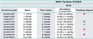 Валютные стратеги BNP Paribas обновили свою еженедельную оценку ситуации на валютном рынке, в подготовке которой используется квантовая модель «STEER», довольно успешно зарекомендовавшая себя с точки зрения точности своих прогнозов. Напомним, что данный банк является пионером использования данного подхода к оценке «справедливости» текущих валютных курсов. Основу данной методики представляет взаимосвязь между процентными ставками, стоимостью акций и ценами на сырьевые товары. Ниже приведена таблица с указанием валютной пары, ее текущего курса, «справедливой» цены, дельты между двумя предыдущими параметрами и сигналом на покупку/продажу.