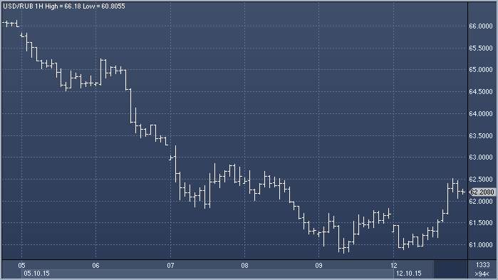 Вчера быки по российской валюте держались до последнего, несмотря на обвал котировок нефти, однако после 20:00 по Москве все же сдались, и доллар/рубль расчетами «завтра» быстро прибавил около 1%, закрывшись, примерно, на 40 копеек выше пятницы. Впрочем, рубль остается в тройке лидеров роста среди валют развивающихся стран, уступая только индонезийской рупии и колумбийскому песо. Теперь, по мнению ряда экспертов, Банк России, наконец-то, сможет стимулировать восстановление экономики, возобновив цикл снижения ключевой ставки, прерванный на предыдущем заседании (прим. ProFinance.ru: рынок производных инструментов, всего неделю назад учитывавший в ценах повышение ключевой ставки в течение трех месяцев, теперь учитывает ее снижение на 0.06% на том же временном отрезке). Отметим, что недавний рост цен на нефть стимулировал интерес к российским активам, номинированным и в долларах. Так, крупнейший ориентированный на Россию ETF, Market Vectors Russia, фиксировал чистый приток средств каждый день с прошлого вторника по пятницу, а общая сумма чистой покупки его паев за неделю составила $129.6 миллиона (рекордная цифра с февраля). В то же время, объявленный в прошлом году российским правительством курс на импортозамещение пока явно проваливается. В 1998 году цены на нефть снизились к августу, примерно, на 50%, а рубль рухнул, и, как следует из данных Bloomberg, спустя год производство автомобилей в России выросло на 35%, а продуктов и водки на 60%+. В этот раз статистика за август (против аналогичного периода год назад) продемонстрировала очень незначительное изменение объема местного производства продуктов, табачных изделий и напитков, включая алкогольные, а также зафиксировала падение объема производства автомобилей на 31%.