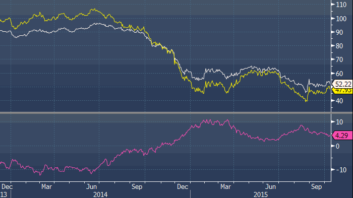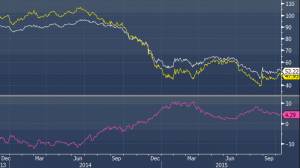 ОПЕК продолжает наращивать объем добычи, а данные из России и Бразилии в сентябре показали, что здесь уровень производства нефти достиг новых рекордных максимумов. Для устранения дисбаланса рынку необходимо существенное падение добыче в странах, не входящих в ОПЕК, а перспективы такой корректировки выглядят все более туманными. Данные Baker Hughes указывают на сокращение числа буровых установок, однако для снижения добычи таковое должно продолжиться. В Goldman Sachs отмечают, что имеющиеся данные позволяют ожидать сокращения добычи в США на 250 000 баррелей в день в этом году, тогда как в следующем уровень добычи останется неизменным. Для устойчивого восстановления цен добыча в 2016, как считают в банке, должна упасть на 585 000 баррелей в день. Между тем, те же данные Baker Hughes сигнализируют о росте числа буровых установок за пределами США. У проблемных производителей нефти по-прежнему остается доступ к финансовым ресурсам (только за последние три недели они привлекли около $1.5 млрд.). Запасы нефти и нефтепродуктов продолжают расти, что ведет к дальнейшему сокращению логистических мощностей и снижению свободных мощностей хранилищ, а этом может способствовать падению цен на нефть к уровню себестоимости добычи. Геополитическая напряженность возросла, но ее очаги остаются обособлены от регионов производства нефти. Goldman Sachs прогнозирует рост спроса на нефть в 2015 на 1.62 млн. баррелей в день и на 1.28 млн. баррелей в день в 2016, что предполагает избыток предложения на рынке в объеме 400 000 баррелей в день. Goldman Sachs придерживается трехмесячного прогноза по нефти WTI на уровне $42, шестимесячного — на уровне $40 и двенадцатимесячного — на уровне $45 за баррель