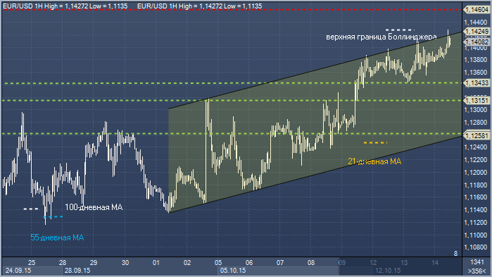Евро/доллар. Технический взгляд Сопротивление 4: $1.1584 - максимум 25 августа Сопротивление 3: $1.1483 - верхняя граница недельного Боллинджера Сопротивление 2: $1.1460 - максимум 18 сентября Сопротивление 1: $1.1427 - верхняя граница дневного Боллинджера, часовое сопротивление 14 октября Цена: $1.1408 Поддержка 1: $1.1376 - часовая поддержка 14 октября Поддержка 2: $1.1343 - минимум 13 октября Поддержка 3: $1.1315 - часовая поддержка 9 октября Поддержка 4: $1.1257 - 21-дневное скользящее среднее значение