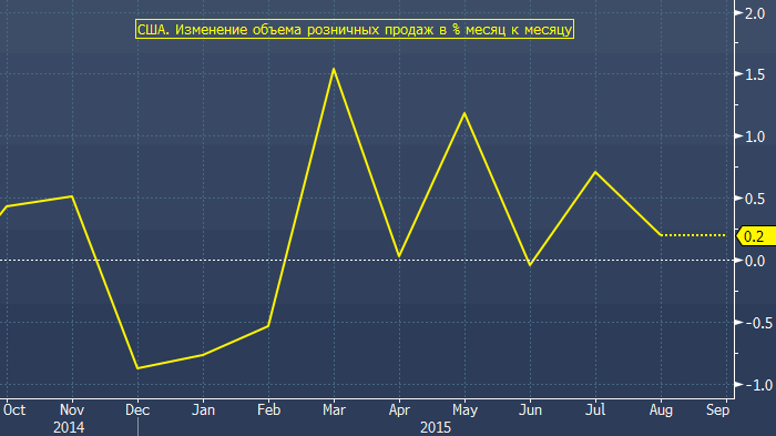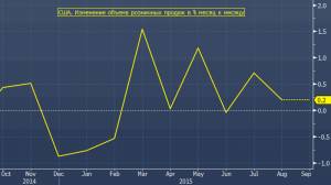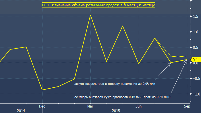Пакет американской макроэкономической статистики оказался слабым. Розничные продажи в сентябре выросли на 0.1% по сравнению с августом, хотя экономисты в среднем прогнозировали увеличение на 0.2%. При этом августовские данные были пересмотрены в сторону понижения с 0.2% до 0.0% по сравнению с июлем. Сентябрьские розничные продажи без учета продаж автомобилей упали на 0.3% по сравнению с предыдущим месяцем, тогда как в среднем прогнозировалось снижение лишь на 0.1%. Августовское значение этого показателя также был пересмотрено с роста на 0.1% к июлю в пользу снижения на 0.1% к июлю. Индекс цен производителей (PPI) в сентябре упал на 0.5% к августу. Это также хуже ожиданий (прогнозировалось падение на 0.2%). По сравнению с аналогичным месяцем годом ранее индекс цен производителей упал на 1.1% (прогнозировалось снижение на 0.8%).