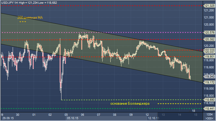 Доллар/иена. Технический взгляд Сопротивление 4: Y120.57 - максимум 6 октября Сопротивление 3: Y120.38 - часовое сопротивление 6 октября Сопротивление 2: Y120.08 - максимум 13 октября, 21-дневное скользящее среднее значение Сопротивление 1: Y119.90 - часовое сопротивление 13 октября Цена: Y119.48 Поддержка 1: Y118.68 - минимум 2 октября Поддержка 2: Y118.56 — нижняя граница недельного канала Боллинджера Поддержка 3: Y118.44 — минимум 25 августа Поддержка 4: Y118.23 — часовая поддержка 24 августа