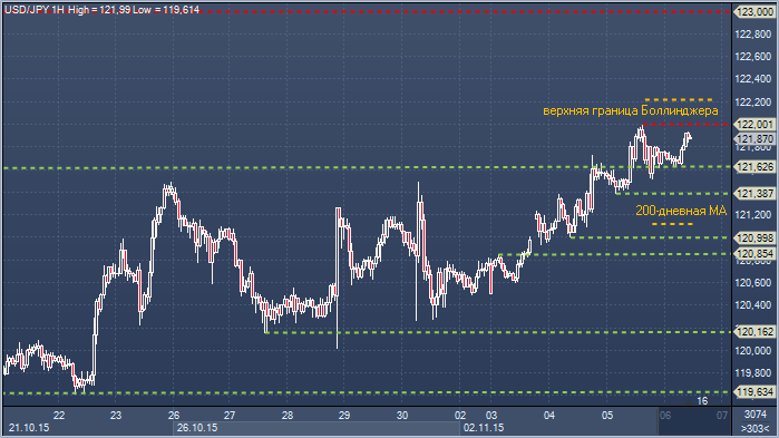 Доллар/иена. Технический взгляд Сопротивление 4: Y123.68 - минимум 19 августа, теперь сопротивление Сопротивление 3: Y123.00 - минимум 27 июля, теперь сопротивление Сопротивление 2: Y122.21 — верхняя граница Боллинджера Сопротивление 1: Y122.00 - максимум 5 ноября Цена: Y121.87 Поддержка 1: Y121.62 - часовая поддержка 5 ноября Поддержка 2: Y121.38 - минимум 5 ноября Поддержка 3: Y121.11 - 200-дневное скользящее среднее значение Поддержка 4: Y120.59 - минимум 3 ноября