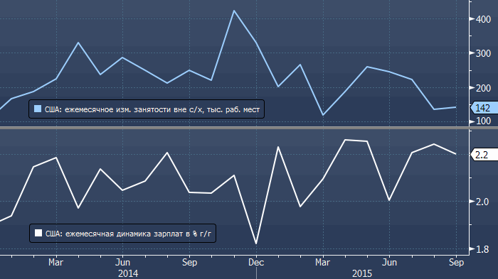 Сегодняшний день примечателен публикацией отчета по рынку труда США, который, как ожидается, даст больше ясности в вопросе о том, повысит ли ФРС ставки в этом году или нет. Экономисты, опрошенные Bloomberg, в среднем ожидают, что после роста на 142 000 в сентябре число рабочих мест в октябре увеличится на 185 000. Аналитики RBS находятся в списке оптимистов, прогнозируя рост занятости на 205 000, а также рост заработных плат на 0.3% м/м — в годовом исчислении рост показателя может достичь 2.3% - 2.4%, что станет максимальным значением с 2009 года, хотя все же и не дотягивает до докризисного уровня. В банке полагают, что сегодня возможны следующие три сценария развития событий:
