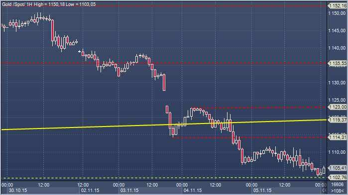 Золото. Технический взгляд Сопротивление 4: $1135.5 - минимум 30 октября, теперь сопротивление Сопротивление 3: $1122.9 - максимум 4 ноября Сопротивление 2: $1119.0 — основание сломанного бычьего канала Сопротивление 1: $1114.9 — минимум 3 ноября, теперь сопротивление Цена: $1105.4 Поддержка 1: $1103.2 — минимум 5 ноября Поддержка 2: $1099.4 — минимум 11 сентября Поддержка 3: $1078.1 — минимум 24 июля Поддержка 4: $1078.1 — минимум 24 июля