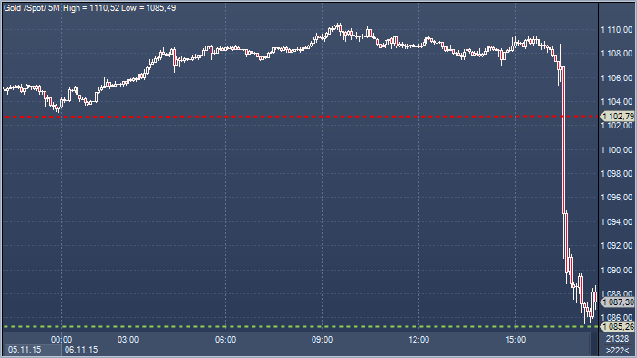 Золото обрушилось вслед за всеми активами, цены которых исчисляются в долларах, так как американская валюта ответила агрессивным ростом на неожиданно сильные данные по рынку труда в США. Уровень безработицы в США в октябре составил 5%, а число рабочих мест в несельскохозяйственных отраслях экономики выросло на 271 тысячу, сообщает министерство труда страны. Аналитики, ожидали, что уровень безработицы составит 5,1%, а число рабочих мест вырастет на 184 тысячи. Таким образом, показатель безработицы сократился по сравнению с сентябрем на 0,1 процентного пункта: в сентябре сообщалось, что он составлял 5,1%. При этом показатель роста числа рабочих мест стал самым значительным в текущем году. Рост занятости в сентябре был пересмотрен в сторону понижения - со 142 тысяч до 137 тысяч рабочих мест. Минтруда США также сообщил, что почасовая заработная плата в стране в октябре выросла на 2,5% в годовом выражении и составила 25,2 доллара. В месячном выражении почасовая зарплата увеличилась на 0,36%.