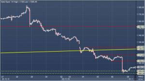 Комментарий:: снижение продолжается быстрыми темпами, особенно после прорыв ниже основания 4-месячного бычьего канала, которое проходит на $1119.5 сегодня. Дальнейшая потеря поддержки на $1099.4 является проблемой для быков, так как она рассматривалась как защита против возвращения рынка к долгосрочному нисходящему тренду, у которого предыдущий минимум на $1078.1, а затем $1031.6 - ближайшие цели. Сопротивление исходит от $1103.2-$1110.9, а затем — от основания канала. Над ними медведям поможет уровень $1122.9, который считается более важным.