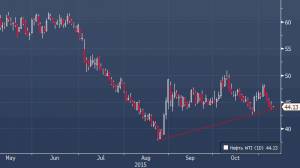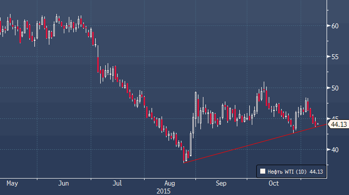 Нефть торгуется без особого оптимизма, что, впрочем, неудивительно — позитивных новостей по-прежнему не наблюдается, а техническая картина за последнее время подпортилась. Американская валюта продолжает пользоваться спросом на спадах, а рынок, тем временем, живет ожиданиями дальнейшего роста запасов нефти — согласно опросу экономистов, опрошенных Bloomberg, они увеличатся седьмой раз подряд — на 1.275 млн. баррелей. Нефть WTI пока остается выше линии тренда с минимумов августа, однако быки выглядят неуверенными, и прорыв ниже может стать катализатором для движения к $42.58 (минимум 27 октября), а потенциально и ниже.