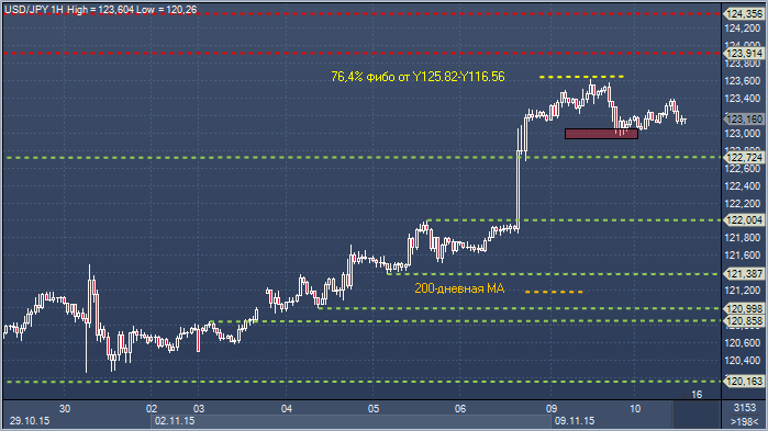 Доллар/иена. Технический взгляд Сопротивление 4: Y124.35 - предыдущая область консолидации в июне-августе Сопротивление 3: Y124.12 — 2%-ная волатильность Сопротивление 2: Y123.96 — 1.618% проекции Y121.72-Y118.10 Сопротивление 1: Y123.63 - 76,4% коррекции Фибоначчи от Y125.82-Y116.56 Цена: Y123.16 Поддержка 1: Y122.95/05 - часовая поддержка Поддержка 2: Y122.72 — часовое основание 6 ноября Поддержка 3: Y122.28 — минимум отката 6 ноября Поддержка 4: Y121.99 — максимум 5 ноября, теперь поддержка
