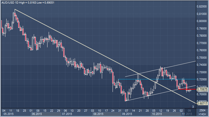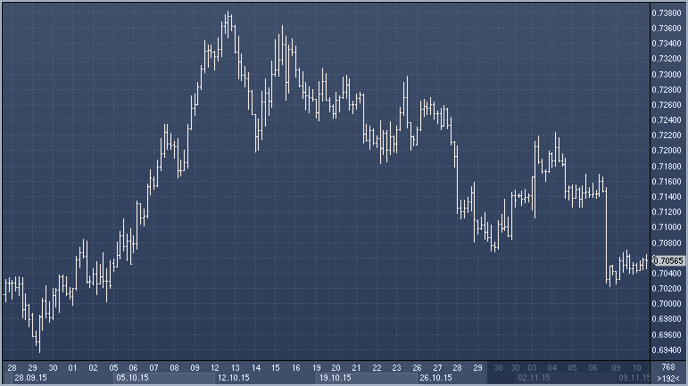 После пробития нижней линии восходящего коррекционного канала на дневном графике, цены уже 3 дня не могут подняться выше минимумов 29 октября на 0.7067. Это указывает на силу вернувшейся медвежьей тенденции, поскольку мы получили с позиции технического анализа сигнал продолжения среднесрочного нисходящего тренда. В настоящий момент область между 0.7067 и 0.7110 является привлекательной для входа в короткие позиции в паре аусси/доллар. Первоначальная цель находится на 0.6900 — 0.6880. Это сентябрьские минимумы. Текущие цены должны быть там уже сейчас. Следовательно, австралийский доллар запаздывает с ослаблением, чем стоит воспользоваться. Защитный стоп-приказ на покупку, ограничивающий потенциально возможные убытки, следует разместить на 0.7160