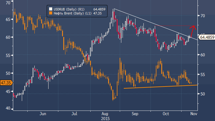 Нефть сегодня не падает, а рубль пытается прибавить в цене к доллару при поддержке национальных экспортеров, которые покупают российскую валюту, готовясь платить ноябрьские налоги. На последний месяц осени приходится порядка 425 млрд. рублей (6.6 млрд. долларов) налоговых выплат. Не стоит заражать себя излишним оптимизмом, поскольку устойчивость рубля сейчас выглядит как являние временное. Стоит ценам на нефть возобновить снижение и рубль уверенно начнет слабеть. А основания для нисходящей динамики нефтяных котировок имеются. Сегодня поздно вечером будут опубликованы еженедельные данные по запасам нефти в США от Американского института нефти (API), которые составляются на добровольной основе и предшествуют выходу официальной еженедельной статистики от Министерства энергетики. Это потенциально медвежий для нефти фактор, который может в очередной раз отразить, что производство не спешит сокращаться.