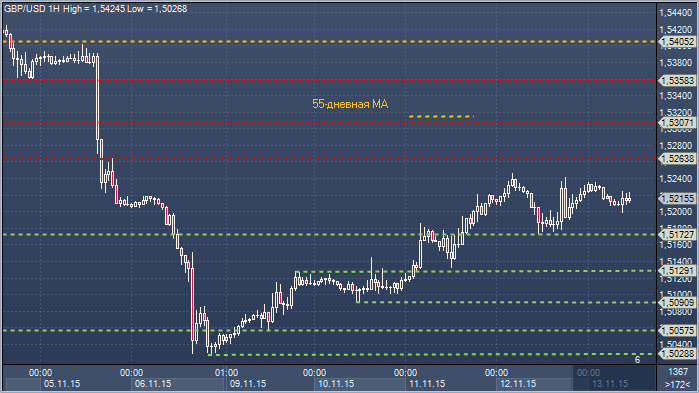 Фунт/доллар. Технический взгляд Сопротивление 4: $1.5405 - часовая поддержка 4 ноября, в настоящее время - сопротивление Сопротивление 3: $1.5358 — минимумы 3 и 4 ноября, в настоящее время - сопротивление Сопротивление 2: $1.5316 - 55-дневное скользящее среднее значение Сопротивление 1: $1.5263 - часовое сопротивление 5 ноября Цена: $1.5215 Поддержка 1: $1.5173 - минимум 12 ноября Поддержка 2: $1.5128 - максимум 9 ноября, теперь — поддержка Поддержка 3: $1.5090 - минимум 10 ноября Поддержка 4: $1.5057 - часовая поддержка 9 ноября