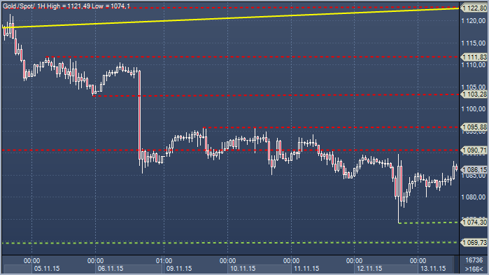 Золото. Технический взгляд Сопротивление 4: $1121.2 — нижняя граница пробитого восходящего канала Сопротивление 3: $1110.4 — максимум 5 ноября Сопротивление 2: $1095.5 — максимум 9 ноября Сопротивление 1: $1090.7 - часовое сопротивление Цена: $1086.1 Поддержка 1: $1075.1 — минимум 12 ноября Поддержка 2: $1069.7— равная цель падения от $1232.1 Поддержка 3: $1045.5 — минимум февраля 2010 Поддержка 4: $1031.6 — проектируемая нижняя граница 2-летнего медвежьего канала