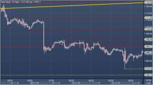 Комментарий:: снижение после прорыва ниже основания 4-месячного бычьего канала, которое проходит на $1121.7 сегодня, продолжается, хотя и более медленными темпами. Дальнейшая потеря поддержки на $1099.4 является проблемой для быков, так как она рассматривалась как защита против возвращения рынка к долгосрочному нисходящему тренду, у которого предыдущий минимум на $1078.1, а затем $1031.6 - ближайшие цели. Сопротивление исходит от $1090.7-$1095.5. Прорыв выше этой области поможет любому восстановлению ближайшего времени