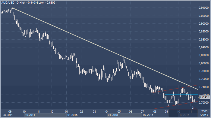 Аусси/доллар. Мы считаем, что следует продавать австралийскую валюту на попытках роста. Довольно прочно выглядит краткосрочная область сопротивления между 0.7150 и 0.7180. Ключевым сопротивлением является линия медвежьего тренда с текущим значением на 0.7270. Пока она не пробита, мы предпочитаем играть короткие позиции.