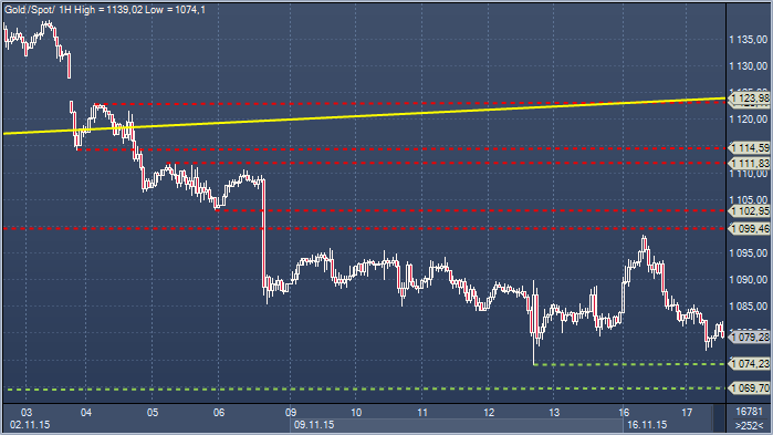 Золото. Технический взгляд Сопротивление 4: $1122.8 — основание пробитого бычьего канала Сопротивление 3: $1114.9 — минимум 3 ноября, теперь сопротивление Сопротивление 2: $1110.4 — максимум 5 ноября Сопротивление 1: $1099.4 — минимум 11 сентября, теперь сопротивление Цена: $1079.28 Поддержка 2: $1075.1 — минимум 12 ноября Поддержка 3: $1069.7 — равная цель падения от $1232.1 Поддержка 3: $1060.9 - 1,618 % проекции от $1098.0-$1075.1 Поддержка 4: $1045.5 - минимум февраля 2010