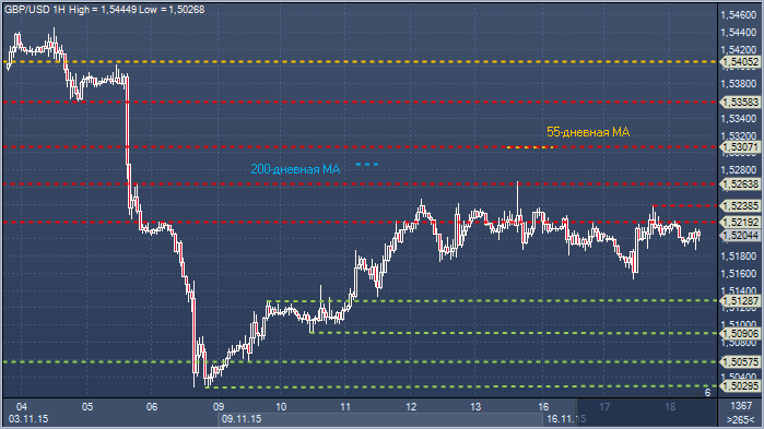 Фунт/доллар. Технический взгляд Сопротивление 4: $1.5307 - 55-дневное скользящее среднее значение Сопротивление 3: $1.5273 - 21-дневное скользящее среднее значение Сопротивление 2: $1.5263 - часовое сопротивление 5 ноября Сопротивление 1: $1.5239 - максимум 17 ноября Цена: $1.5204 Поддержка 1: $1.5128 - максимум 9 ноября, теперь поддержка Поддержка 2: $1.5090 - минимум 10 ноября Поддержка 3: $1.5057 - часовое основание 9 ноября, основание Боллинджера Поддержка 4: $1.5024 - минимум 6 ноября