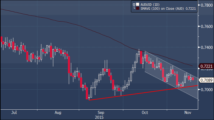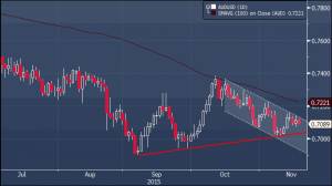 Австралийская валюта сумела удержаться от прорыва линии поддержки с минимумов этого года, однако воспользоваться стабилизацией и позитивными данными по рынку труда, быкам пока так и не удалось. Настрой остается подавленным, пара держится в рамках нисходящего канала с середины октября, и развитие событий на рынке сырья (цены на ряд активов, в том числе и железную руду, упали к свежим долгосрочным минимумам) и очередной прилив беспокойства относительно ситуации в китайской экономике не дают особых надежд на перелом в ситуации. Прорыв выше $0.7125 может поддержать восстановление к $0.7160, но о том, что техническая картина обретает более конструктивный для аусси характер можно будет говорить лишь в случае стабилизации курса выше $0.7200/21 (100-дневная sma). Пока же внимание остается сконцентрировано на поддержке в районе $0.7030, прорыв которой откроет дорогу к $0.69