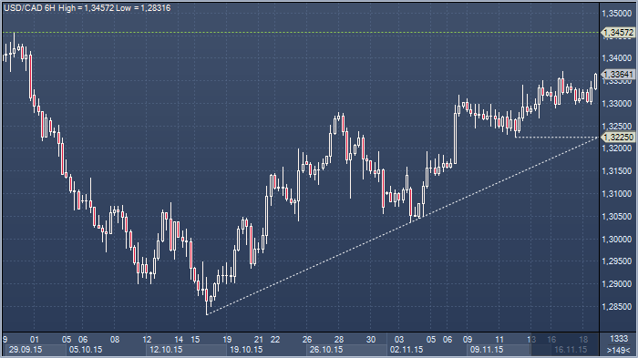 Восходящий импульс в доллар/канаде в последние дни несколько ослаб, но в условиях продолжающих падать цен на нефть, у канадской валюты не слишком много поводов для роста. Поводом для некоторой коррекции могла бы послужить потеря опоры в районе C$1.3290 (впрочем, биды видны уже в районе C$1.3280) — в этом случае от пары можно было бы ожидать возвращения к C$1.3243 (23.6% от роста с 15/10) и к линии тренда с минимумов октября/минимуму 12 ноября в районе C$1.3225. Пока, однако, тон торгов остается позитивным, а попытки снижения сдержанными, и в центре внимания остаются максимумы этого года около C$1.3457.