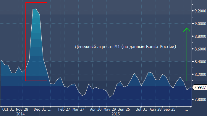 12 ноября Банк России объявил о грядущем увеличении наличной рублевой массы на 1 триллион (прим. ProFinance.ru: около $15 млрд), объяснив это сезонным ростом спроса на наличность. По статистике ЦБ РФ, объем рублевой наличности в обращении ежегодно резко возрастает в декабре, а затем также резко падает в январе. Например, в декабре 2014 года эта цифра выросла на 914 млрд до 9.2 трлн, а в январе 2015 года сократился до 8 трлн. Что касается роста спроса на наличность в декабре, то в БКС ее объясняют резким увеличением расходов бюджета, а, что касается сокращения наличной массы в январе, то Ассоциация российских банков (АРБ) считает это следствием оттока капитала, конвертации рублей в валюту и перевода их на депозиты. В Банке России подчеркнули, что рост наличной массы не приведет «ни к каким другим эффектам», и «речь не идет об увеличении денежной массы (т.е. всей совокупности денег в экономике: наличных и безналичных)».