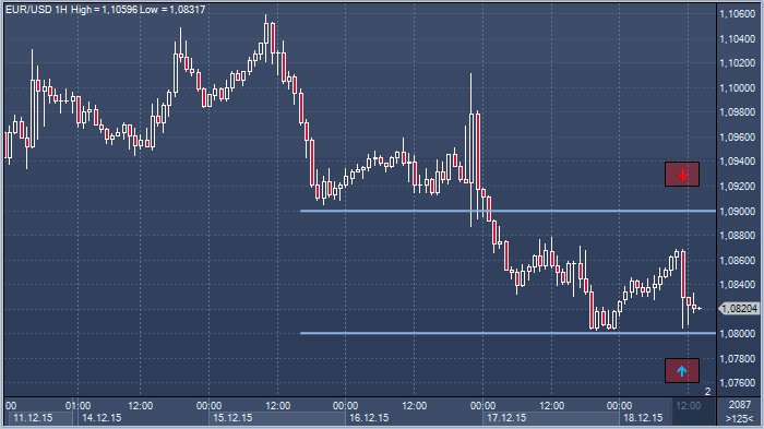 Приведем пример. Евро/доллар. Определяем диапазон: 1.0900 — 1.0800. Внутри диапазона ловим начало движения и присоединяемся к нему. Если движение пропущено, продолжаем выжидать. Если будет пробита верхняя граница, начинаем рассматривать возможность продажи в диапазоне 1.0920/40. Желательно ближе к 1.0940. Если будет пробита нижняя граница диапазона, начинаем рассматривать покупки в диапазоне 1.0780/60. Желательно ближе к 1.0760.