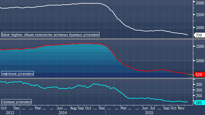 Сегодня будут опубликованы еженедельные данные нефтегазовой сервисной компании Baker Hughes по количеству активных буровых установок, которые, вполне вероятно, в очередной раз продемонстрируют сокращение. За последние 15 недель количество активных нефтяных установок демонстрировало сокращение 14 раз. По состоянию на 11 декабря их осталось 524 установки, что является 5-летним минимумом.