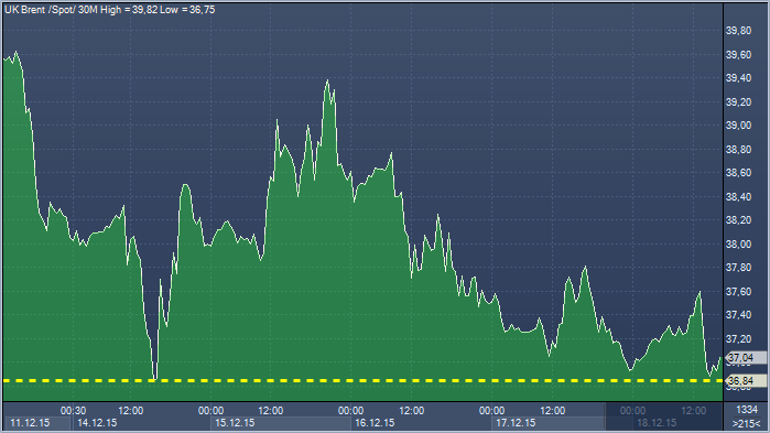 Первые последствия роста ставки ФРС начали проявлять себя. Не произошло ожидавшегося многими ослабления доллара при фиксации длинных позиций, как это было сразу после прошлых повышений. Агрегатный индекс доллара поднялся за день с 98,6 до 99,1. Причем перед концом декабря вероятно закрытие годовых позиций инвесторов, что может придать коррекцию наблюдающемуся в последние дни усилению доллара. Вероятно, декабрьских максимумов он вновь достигнет лишь в следующем году. Но пока рост доллара – дополнительный фактор давления на нефть, наряду с бездействием ОПЕК, увеличением запасов в мире, снятием запрета на экспорт из США. Нефтяные котировки после решения ФРС показали склонность к дальнейшему падению. Общий тренд – вниз, к $35 за баррель по нефти марки Brent. Но сейчас на достигнутых минимумах возможна приостановка, некоторая коррекция, проторговка в боковых коридорах. Для Brent это $36,4–38,0 за барр., по WTI- $34,5–39,0.