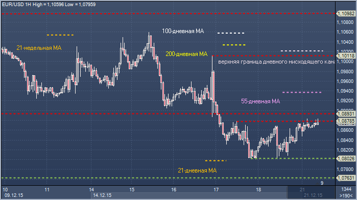 Евро/доллар. Технический взгляд Сопротивление 4: $1.1021 — верхняя граница дневного нисходящего канала Сопротивление 3: $1.1010 - максимум 16 декабря Сопротивление 2: $1.0938 - 55-дневное скользящее среднее значение Сопротивление 1: $1.0893 - часовое сопротивление 17 декабря Цена: $1.0868 Поддержка 1: $1.0802 - минимум 17 декабря Поддержка 2: $1.0798 - 21-дневное скользящее среднее значение Поддержка 3: $1.0796 - минимум 7 декабря Поддержка 4: $1.0763 - максимум 19 ноября, в настоящее время - поддержка