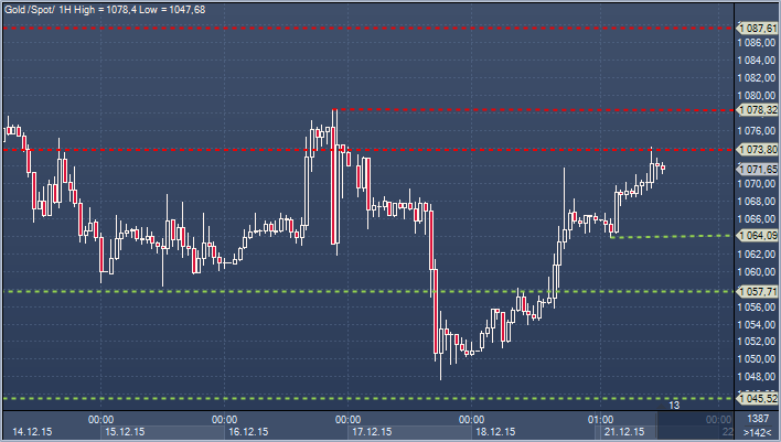 Комментарий:неспособность закрепиться и закрыться выше $1087.6 в течение последней недели или около того стала катализатором для последнего падения, в ходе которого была протестирована область поддержки $1058.5-$1054.5. Это оставляет февральский минимум 2010 на $1045.5 подверженным риску тестирования. В то же время, некоторые перепроданность отмечается на часовых осцилляторах, что может спровоцировать отскок к максимуму 16 декабря $1078.1, который является препятствием к возобновлению тестирования ключевого уровня $1087.6