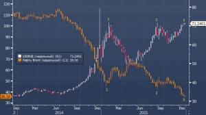 Вчера Украина не погасила облигации внешних государственных займов на $3 млрд, принадлежащих России. Это означает дефолт по долговым обязательствам для Украины и новую волну напряжения для России. Ни той, ни другой история не предвещает ничего хорошего, поэтому есть еще надежда на то, что сумма все же будет погашена в течение льготного периода, который продлиться до 31 декабря 2015 года. Если платеж все же поступит, это может оказать небольшую поддержку российской валюте, которая итак неплохо держится на плаву, невзирая на обвал нефти к 11-летнему минимуму. Такое поведение пары доллар/рубль может говорить о том, что текущие уровни – это максимум достигнутого и дальнейшему росту препятствуют крупные институциональные игроки. Если так, текущие уровни могут выглядеть как привлекательные точки входа краткосрочными продажами в течение недели, естественно, при условии скорой коррекции цен на нефть. Дополнительным фактором поддержки в ближайшее время может стать и приближение налогового периода