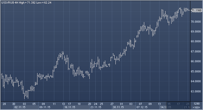 Сегодня можно рассчитывать на коррекцию доллара к 71 руб. на фоне роста цен на нефть марки Brent к $36,6 за баррель. Спрос на валюту в РФ остается низким, а ее платежный баланс – крепким, позволяя рублю чувствовать себя уверенно. Согласно статистике Банка России, на 22 декабря задолженность кредитных организаций по второй части сделок валютного РЕПО снизилась с максимума года – $34 млрд, до $19,4 млрд. По расчетам регулятора, в первом квартале 2016 года выплаты по внешним долгам корпоративного сектора РФ с учетом внутригрупповых платежей составят лишь $6 млрд. С точки зрения платежного баланса, РФ сокращает потребление импорта сильнее, чем падает ее экспорт. Согласно данным ФТС, за первые десять месяцев текущего года российский импорт снизился на 38% г/г, а экспорт – на 31,8%.