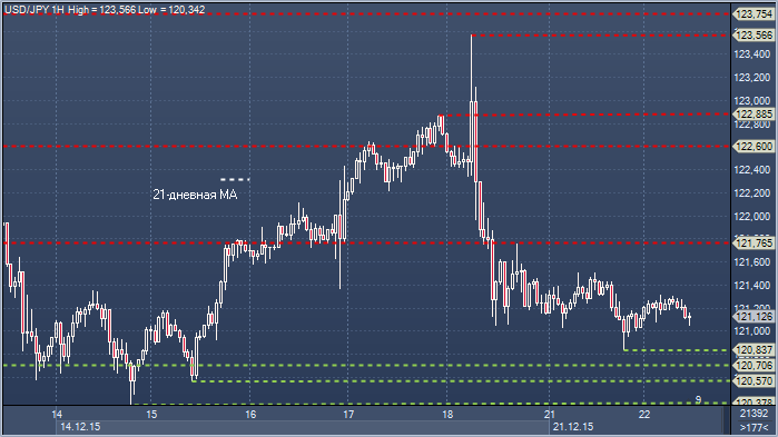 Доллар/иена. Технический взгляд Сопротивление 4: Y123.75 - максимум 18 ноября Сопротивление 3: Y123.55 - часовое сопротивление 18 декабря Сопротивление 2: Y122.60 - переменная часовая поддержка / сопротивление Сопротивление 1: Y121.76 - часовое сопротивление 18 декабря Цена: Y121.43 Поддержка 1: Y120.82 - минимум 21 декабря Поддержка 2: Y120.70 — восходящая недельная трендовая линия Поддержка 3: Y120.57 - минимум 15 декабря Поддержка 4: Y120.34 - минимум 14 декабря