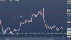 Комментарий: неспособность преодолеть область Y123.75-81 привела в результате к закрытию ниже 55-, 100- и 200- дневного скользящего среднего значения в области Y121.50-60. Следует отметить, что восходящая недельная трендовая линия проходит примерно на Y120.70 на той неделе. Медведи нуждаются в закрытии ниже Y120.34, чтобы подтвердить прорыв и перенести фокус на область Y119.29-62, где отмечена нижняя граница долгосрочного недельного канала. Быкам нужно закрытие выше Y121.76, чтобы получить передышку