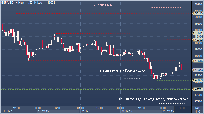 Фунт/доллар. Технический взгляд Сопротивление 4: $1.5003 - максимум 17 декабря Сопротивление 3: $1.4950 — максимум 18 декабря Сопротивление 2: $1.4930 - максимум 21 декабря Сопротивление 1: $1.4864 - минимум 17 декабря, теперь сопротивление Цена: $1.4837 Поддержка 1: $1.4805 - минимум 22 декабря Поддержка 2: $1.4734 — нижняя граница нисходящего дневного канала Поддержка 3: $1.4699 - минимум 15 апреля Поддержка 4: $1.4564 — минимум 2015 от 13 апреля