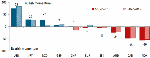 Валютные стратеги BNP Paribas обновили еженедельно публикуемую оценку текущей ситуации на валютном рынке, сгенерированную системой FX Momentum. Как следует из ее названия, система оценивает силу валютных трендов, исходя из текущей динамики валютных курсов, ставок и поведения фондового рынка. В приведенной ниже таблице указаны текущие оценки силы тренда основных валют по шкале от -100 (сильнейший медвежий моментум) до +100 (сильнейший бычий моментум).