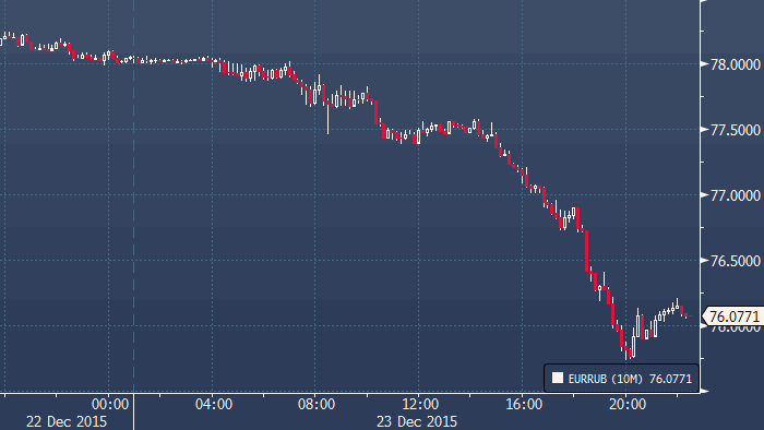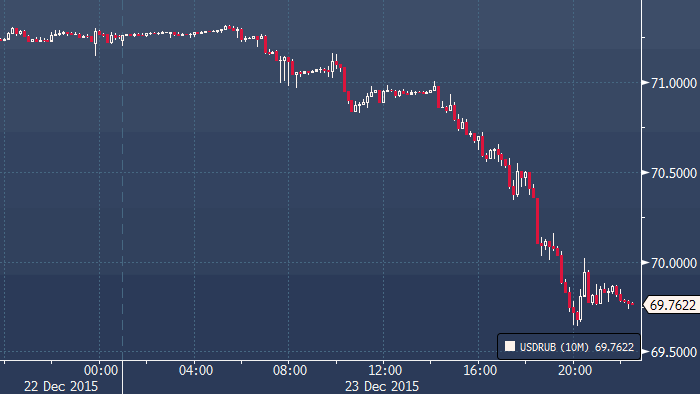 Вчерашние события на рынке нефти не оставили рубль равнодушным, по итогам среды можно сказать, что российская валюта реагирует на рост «черного золота» куда с большей отзывчивостью, нежели на его падение. Стоимость нефти брент в рублях немного подросла, но лишь на скромные 36 рублей — до 2608 рублей за баррель. Ряд аналитиков продолжает говорить о неустойчивости ситуации и о серьезной переоцененности рубля. Тем не менее, хотя особых причин для роста российской валюты не наблюдается, в рубле и так учтено очень много негативных факторов. Между тем, российские активы (облигации) с точки зрения доходности сохраняют привлекательность в свете перспектив не столь скорого снижения ставки Банка России. Что касается денежных потоков, то слабый курс национальной валюты и спад потребительской активности на фоне снижения реальных доходов предполагают слабый спрос на иностранную валюту со стороны импортеров. Активность ритейла, представители которого агрессивно продавали рубль в конце 2014, также недостаточна для формирования сильного движения, а корпоративные счета обладают избыточной долларовой ликвидностью. В этих условиях болезненная реакция быков в доллар/рубле на рост нефти вполне закономерна, тем более что впереди новогодние праздники. Кроме того, не стоит забывать об окончании периода уплаты налогов в бюджет, а также иметь в виду возможность дальнейшего сокращения шортов в нефти под конец года. Доллар/рубль завершает день снижением на 1.50 рубля и держится в районе 69.75, евро/рубль торгуется около 76.08, потеряв 1.97 рубля.