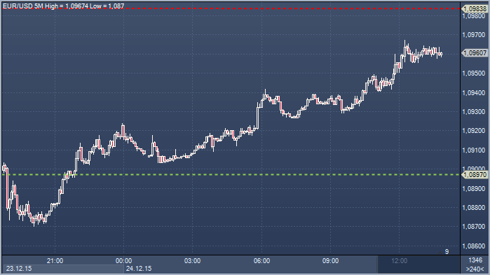 Сегодня, 24 декабря, доллар США снижается к большинству основных валют, в том числе и в паре евро/доллар, которая, очевидно, закроет текущую торговую неделю, а также и месяц, в приличном плюсе. С начала декабря пара выросла почти на 400 пунктов, и это несмотря на первое за почти десятилетний период повышение процентной ставки в США, которая была увеличена на 25 б.п., до 0,50%. Значительному росту пары в начале декабря способствовало решение ЕЦБ по расширению программы количественного смягчения в еврозоне, которое рынок счел недостаточно агрессивным и несоответствующим предыдущим заявлениям главы регулятора Марио Драги. Так, участники рынка ожидали снижения ставки по депозитам на 0,2 п.п., а также увеличения ежемесячной программы покупки облигаций на 25 млрд евро и ее шестимесячного продления. Вместе с тем, ставка была понижена на 0,1 п.п., до -0,3%, а программа количественного смягчения расширена не была, хоть и была продлена на шесть месяцев (до марта 2017 года) с возможностью ее дополнительного продления по истечению нынешнего срока действия.