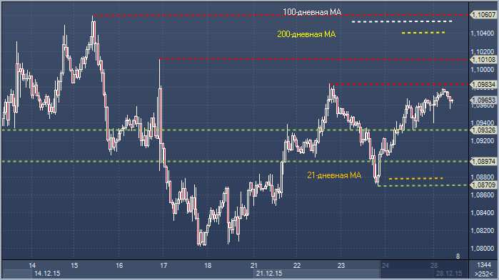 Евро/доллар. Технический взгляд Сопротивление 4: $1.1055 - 100-дневное скользящее среднее значение Сопротивление 3: $1.1040 - 200-дневное скользящее среднее значение Сопротивление 2: $1.1010 - максимум 16 декабря Сопротивление 1: $1.0984 — максимум 22 декабря Цена: $1.0965 Поддержка 1: $1.0932 - часовая поддержка 24 декабря Поддержка 2: $1.0897 - часовая поддержка 24 декабря Поддержка 3: $1.0879 - 21-дневное скользящее среднее значение Поддержка 4: $1.0870 — минимум 23 декабря