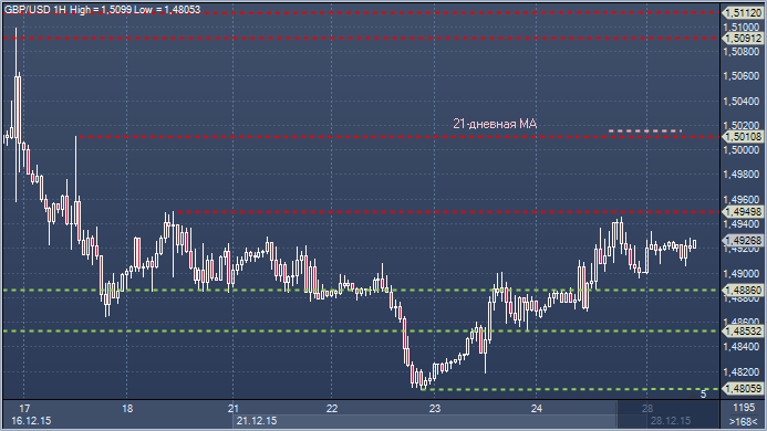 Фунт/доллар. Технический взгляд Сопротивление 4: $1.5107 - минимум 10 декабря, теперь сопротивление Сопротивление 3: $1.5014 - 21-дневное скользящее среднее значение Сопротивление 2: $1.5003 - максимум 17 декабря Сопротивление 1: $1.4950 - максимум 18 декабря Цена: $1.4926 Поддержка 1: $1.4886 - часовая поддержка 24 декабря Поддержка 2: $1.4853 - часовая поддержка 23 декабря Поддержка 3: $1.4805 - минимум 22 декабря Поддержка 4: $1.4708 — нижняя граница нисходящего дневного канала