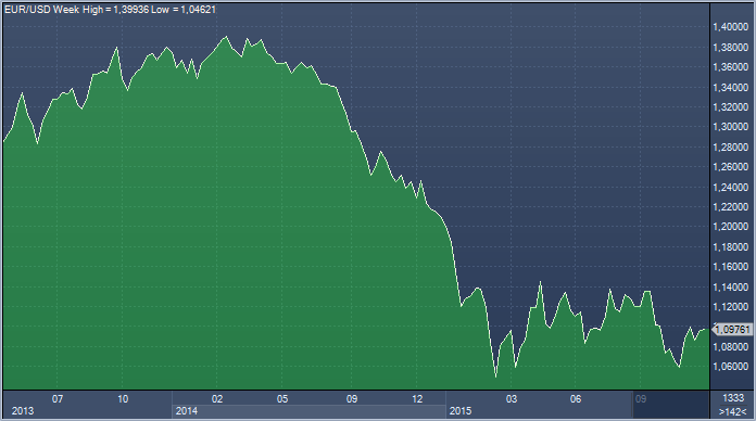 Что-то похожее произошло после запуска программы количественного смягчения ЕЦБ в марте этого года. Так же как и в случае с иеной, произошло ослабление евро, причем в период с начала 2014 года по настоящий момент единая европейская валюта снизилась против доллара примерно на 20%. Ожидалось, что старт программы количественного смягчения подстегнет темпы экономического роста в регионе, оказав поддержку экспорту. Тем не менее, эффект от ослабления валюты и здесь оказался весьма скромным. Более того, в период с июля по сентябрь наблюдался опережающий рост импорта по сравнению с экспортом, в то время как промышленное производство не росло вовсе. Аналитики отмечают, что колебания валют достигают максимального влияния на внешнеторговые потоки через 12-18 месяцев, поэтому к настоящему моменту эффект от ослабления евро и иены должен быть заметен в еврозоне и Японии. Снижение евро против доллара началось в 2014 года, а валюта Японии снижается уже примерно три года.