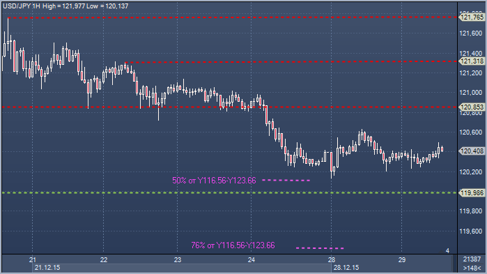 Доллар/иена. Технический взгляд Сопротивление 4: Y122.14 — область первоначального основания 18 декабря Сопротивление 3: Y121.73 - часовой коррекционный максимум 18 декабря Сопротивление 2: Y121.30 — максимум 22 декабря Сопротивление 1: Y120.85 - сопротивление на часовом графике Цена: Y120.40 Поддержка 1: Y119.98/11 — 1%-ная волатильность, 50% от Y116.56-Y123.66 Поддержка 2: Y119.41 - 76,4% коррекции Фибоначчи от Y118.10-Y123.66 Поддержка 3: Y119.27 - 61.8% коррекции Фибоначчи от Y116.56-Y123.66 Поддержка 4: Y118.64 — 2%-ная волатильность