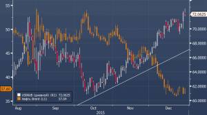 Фактически сегодня последний торговый день (несмотря на то, что завтра торговые площадки еще будут открыты). Мы можем наблюдать, как в различных активах происходит фиксация открытых позиций. Нисходящее движение в евро/долларе, восходящее движение в ценах на нефть и восстановление курса рубля после формирования максимумов в области 72.85 является результатом того, что спекулянты закрывают ранее открытые позиции. Ликвидность на этой неделе в принципе является дефицитом. А сейчас она практически полностью отсутствует. Не исключено, что завтра на утренних торгах рубль вновь попадет под давление продаж и, по аналогии с сегодняшним днем, восстановит утренние потери ближе к вечеру.