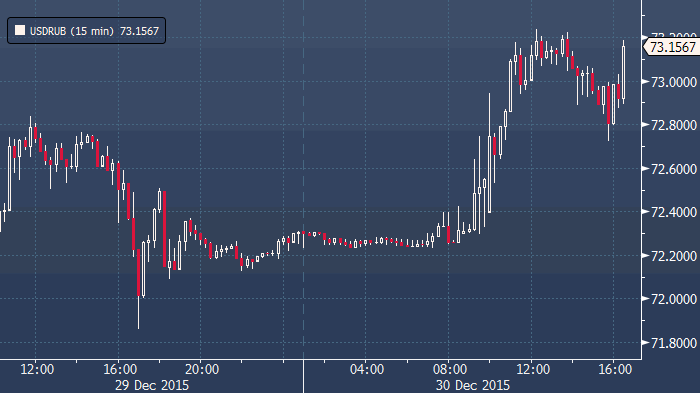 Рубль остается под давлением на низколиквидных торгах в конце года. В целом это не удивительно, поскольку поводов для роста попросту нет. Опубликованное сегодня окончательное чтение данных по ВВП в 3 квартале 2015 подтвердило предварительную оценку — экономика сократилась на 4.1% по сравнению с аналогичным кварталом годом ранее. Уже понятно, что данные по ВВП за 4 квартальную четверть будут довольно печальны, поскольку на этот период приходится новая волна снижения цен на нефть и установление новых минимумов.