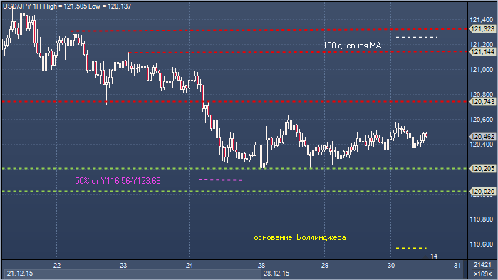 Доллар/иена. Технический взгляд Сопротивление 4: Y121.73 - 55-дневное скользящее среднее значение Сопротивление 3: Y121.25 - 100-дневное скользящее среднее значение Сопротивление 2: Y121.13 - максимум 23 декабря Сопротивление 1: Y120.74 - переменная часовая поддержка / сопротивление Цена: Y120.46 Поддержка 1: Y120.20 - часовая поддержка 28 декабря Поддержка 2: Y120.02 - минимум 28 октября Поддержка 3: Y119.62 - минимум 22 октября Поддержка 4: Y119.57 - основание полосы Боллинджера